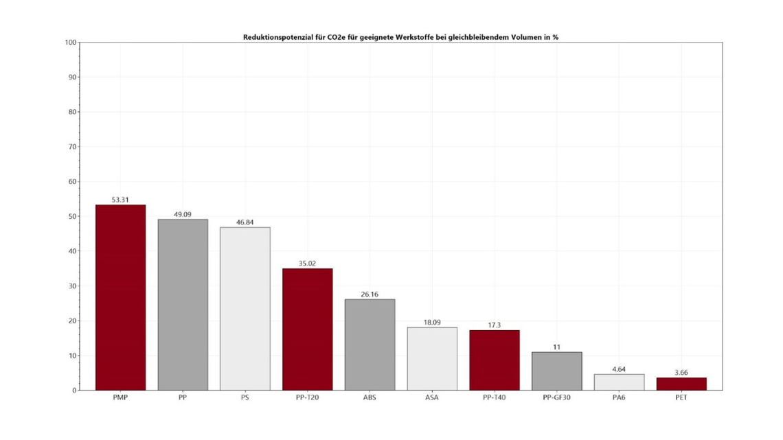 Figure: CO₂e reduction potential of selected materials compared to base material ABS-GF20, taking into account defined input parameters at constant volume (including Young’s modulus > 1 GPa, tensile strength > 20 MPa, density > 0.8 g/cm³).