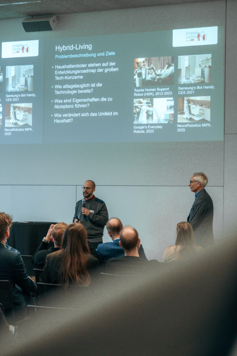 Wie können Mensch und Maschine in Zukunft intuitiv zusammenarbeiten? Diese Frage beantwortet Hybrid-Living auf ganz praktische Weise mit einem einarmigen Roboter, der die Spülmaschine ein- und ausräumt. Gemeinsam mit Miele, Hettich, NEURA Robotics und der Universität Bielefeld entsteht ein System, das sensibel, sicher und lernfähig zugleich ist und zeigt, wie Robotik künftig auch in komplexen Alltagsumgebungen funktioniert.