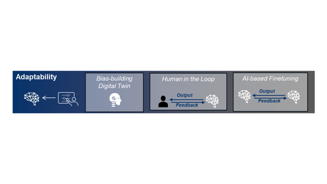 Abbildung 3 fasst zentrale Bausteine der ExplAIn-Methodik zur Adaptierbarkeit zusammen. Sie zeigt unter anderem einen „Bias-building Digital Twin“, bei dem ein digitaler Zwilling – ein virtuelles Abbild der Anlage – genutzt wird, um gezielt verzerrte Situationen zu erzeugen und die KI darauf zu testen. Ergänzend kommen Human-in-the-loop-Ansätze und KI-basiertes Finetuning zum Einsatz.