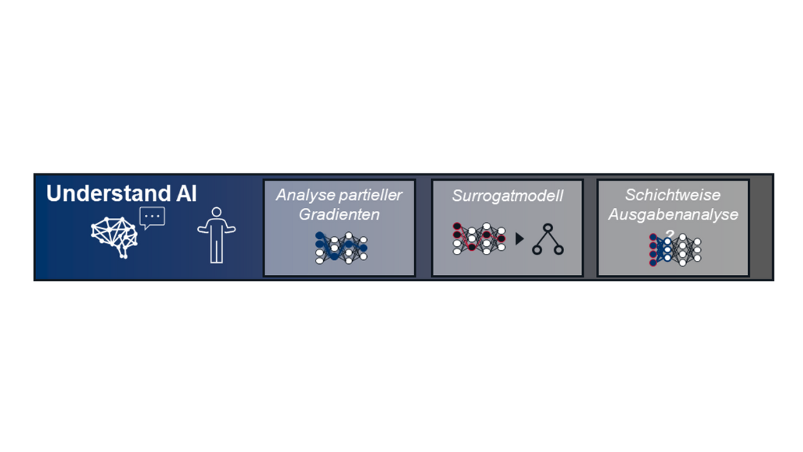 Welche Methoden ExplAIn hierfür nutzt, zeigt Abbildung 1. Dazu zählen die Analyse partieller Gradienten, Surrogatmodelle und schichtweise Ausgabenanalysen. Ziel aller Ansätze: aus einem schwer durchschaubaren Netz von Berechnungen verständliche Entscheidungsregeln machen.